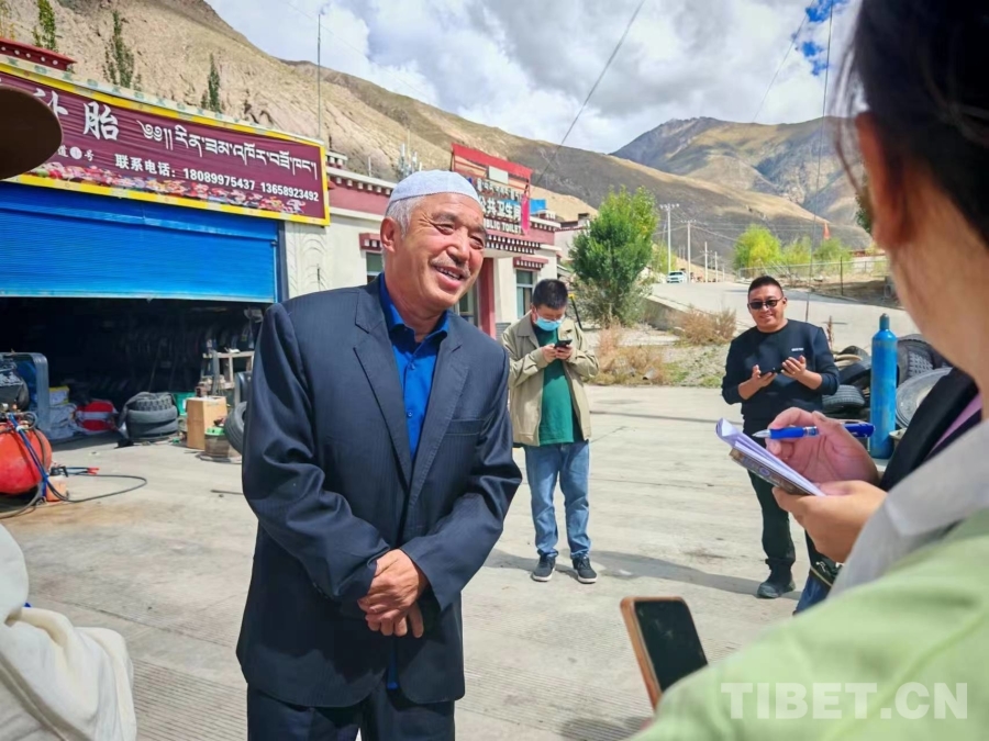 圖為馬彬林在汽修店前接受采訪(fǎng) 攝影:西藏自治區(qū)網(wǎng)信辦格桑