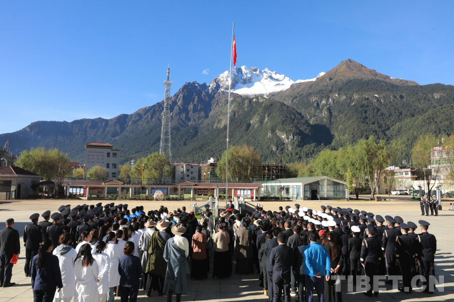 圖為10月1日上午,吉隆縣國門黨建一體化“大黨委”舉辦“七十五載迎盛世 砥礪前行續(xù)華章”主題活動(dòng),組織成員單位在吉隆出入境邊防檢查站營(yíng)區(qū)舉行升國旗儀式 攝影:肖富貴