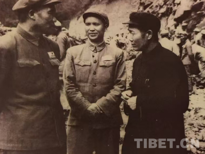 圖為1953年秋,西南軍區(qū)副司令員兼參謀長(zhǎng)李達(dá)代表賀龍司令員慰問(wèn)川藏公路筑路部隊(duì)官兵,陳明義(中)、穰明德陪同李達(dá)(左一)在西藏波密視察公路修建進(jìn)展 圖由陳亦軍提供