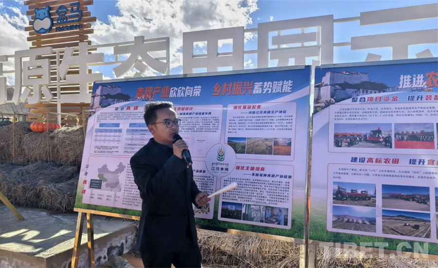 圖為江孜縣負(fù)責(zé)人介紹青稞產(chǎn)業(yè)情況 攝影:陳卓然