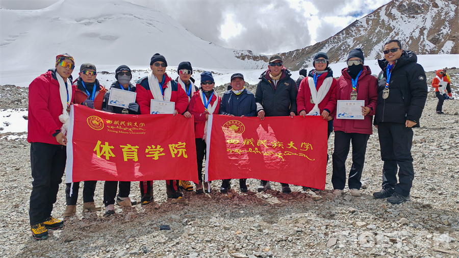 圖為2024第二十一屆中國西藏登山大會西藏民族大學部分師生登頂洛堆峰后合影留念,左四為楊建軍教授 攝影:馮重霖