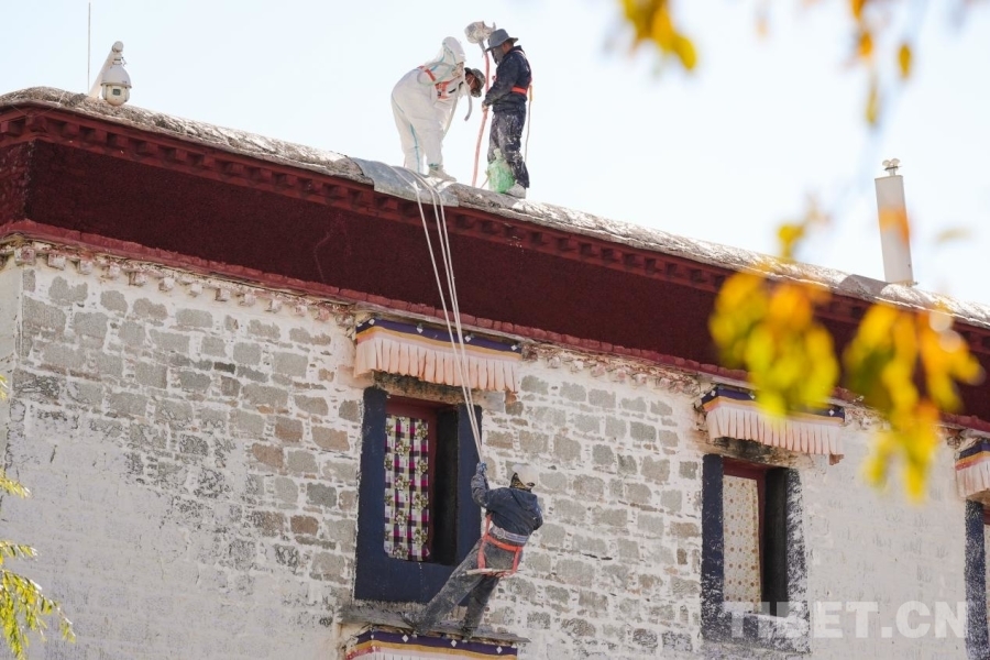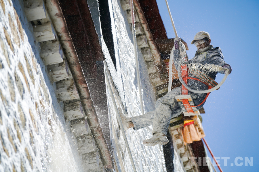 圖為專業(yè)工人正在為布達拉宮外墻噴涂涂料 攝影:邊子捷