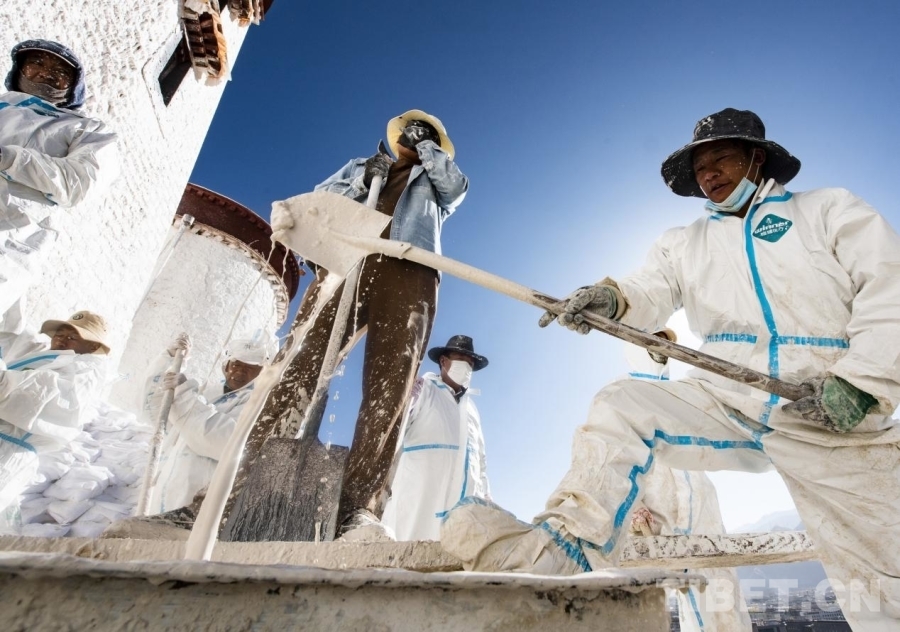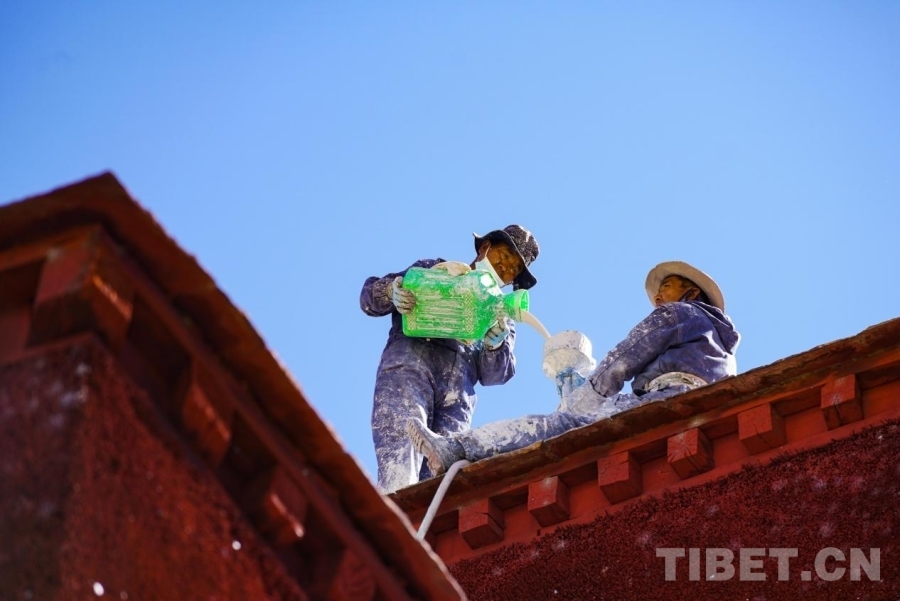 布達拉宮外墻粉刷一般持續(xù)7-10天,要在藏歷的9月22日之前全部完成。此刻,拉薩的雨季剛剛結束,冬季的寒冷結冰尚未到來,每年大家都趕在入冬之前完成這一浩大的粉刷工程。