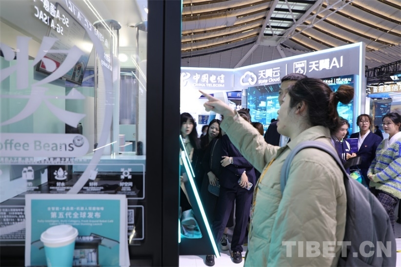 圖為游客排隊(duì)購買機(jī)器人咖啡,咖啡有幾十種選擇,幾十秒就可以制作完畢,在現(xiàn)場異常火爆 攝影:王妍丹