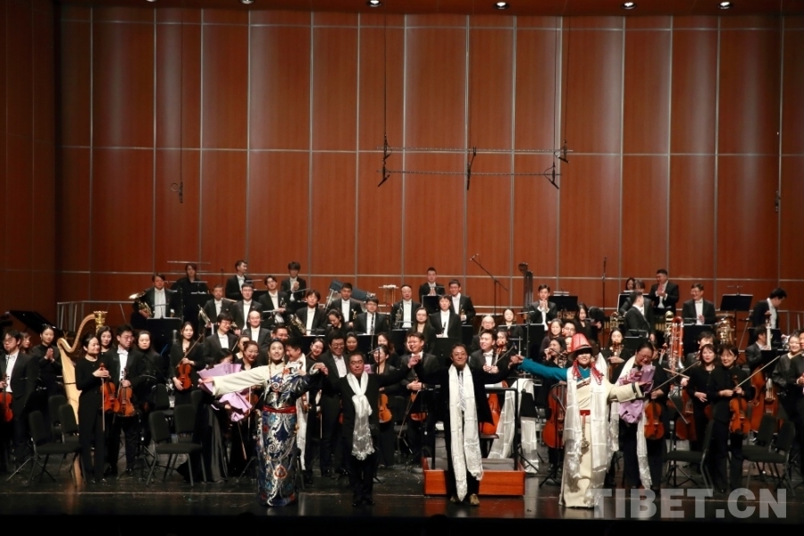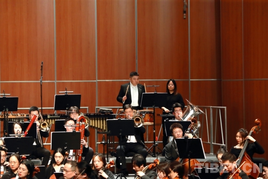 音樂(lè)會(huì)上,兩位藏族歌手演唱了交響樂(lè)主題曲《金橋》,歌曲高亢嘹亮、曲調(diào)悠揚(yáng)。藏戲、山歌等元素的加入,讓交響樂(lè)更加豐富,充滿了濃郁的民族風(fēng)情。