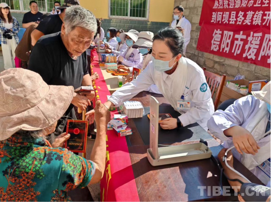 圖為德陽(yáng)援藏醫(yī)療隊(duì)員和若爾蓋當(dāng)?shù)厝罕姾嫌啊∈茉L者供圖