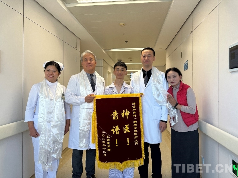 圖為扎西和母親向協(xié)和醫(yī)院骨科醫(yī)療團隊贈送錦旗 攝影:楊眉笑