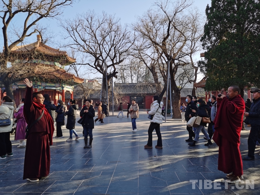 據(jù)雍和宮管理處工作人員孫尚喬介紹,雍和宮初建于康熙三十三年(1694年),雍正三年(1725年)改建為行宮,乾隆九年(1744年)又改建為藏傳佛教格魯派寺廟。寺內(nèi)前部的七座建筑:昭泰門、鐘樓、鼓樓、雍和門、雍和宮、講經(jīng)殿、密宗殿,呈現(xiàn)中國佛教寺院“七堂伽藍”式標準布局。講經(jīng)殿、密宗殿、時輪殿和藥師殿“四大扎倉”的設(shè)立,標志著雍和宮是座藏傳佛教的完整學府。漫步于這座曾經(jīng)的皇家廟宇,西藏佛學院師生們充分了解到雍和宮沉淀豐厚的歷史文化,特別是為何宮改廟以及廟內(nèi)文物的具體情況等。