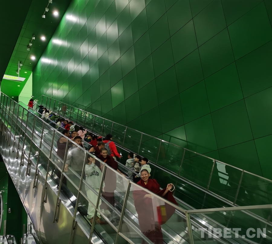 圖為西藏佛學院師生與科技館里的孩子們在扶梯上互相揮手示意