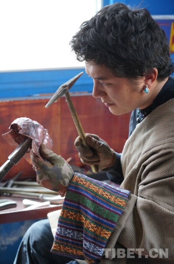 叮叮叮,叮叮?!し欢牵瑐鱽硪魂囮嚱饘偾脫舻穆曧?。掀開門簾,一個(gè)小伙子坐在窗邊,右手拿錘,左手握著佛像架在細(xì)長(zhǎng)的鐵器上,右手的錘子不停地敲擊著,左手也在一邊輕微轉(zhuǎn)動(dòng),目光緊緊鎖在眼前的佛像上柔和而堅(jiān)定,古銅色的面龐與紅銅佛像仿佛在進(jìn)行無聲的“對(duì)話”。