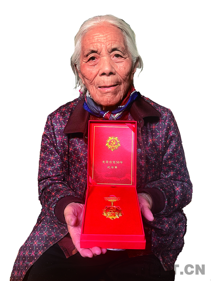 圖為巴西老人展示她的光榮在黨50年紀(jì)念章