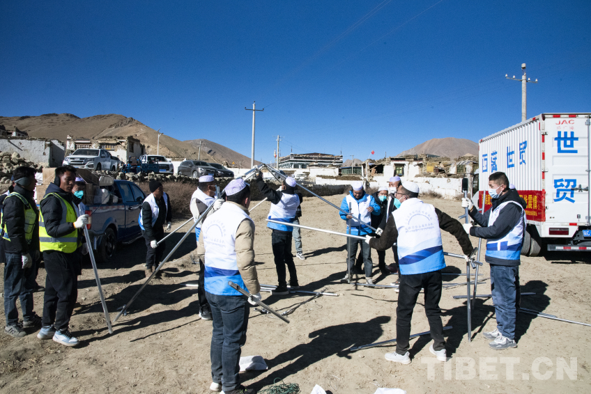 圖為在左措村地震安置點(diǎn)現(xiàn)場(chǎng),山南市乃東區(qū)甘肅青海企業(yè)家商會(huì)愛(ài)心人士正在搭建物資發(fā)放帳篷 攝影:趙振宇