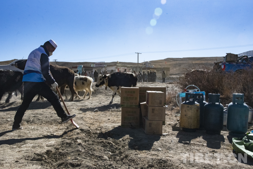 圖為在左措村地震安置點(diǎn)現(xiàn)場(chǎng),山南市乃東區(qū)甘肅青海企業(yè)家商會(huì)愛(ài)心人士正在平整土地準(zhǔn)備為受災(zāi)群眾做飯 攝影:趙振宇