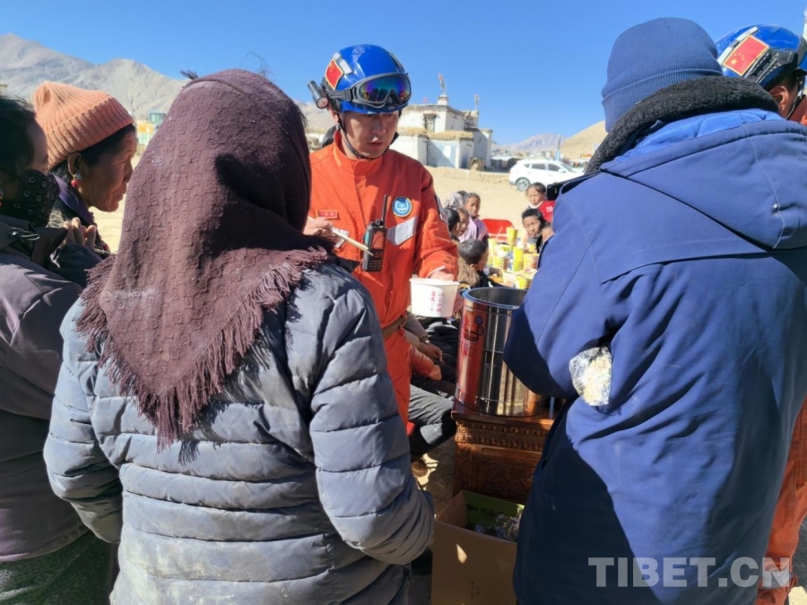 圖為拉薩森林消防大隊(duì)救援人員正在為定日縣曲洛鄉(xiāng)措昂村受災(zāi)群眾分發(fā)熱乎乎的燉菜和饅頭 拉薩森林消防大隊(duì)供圖