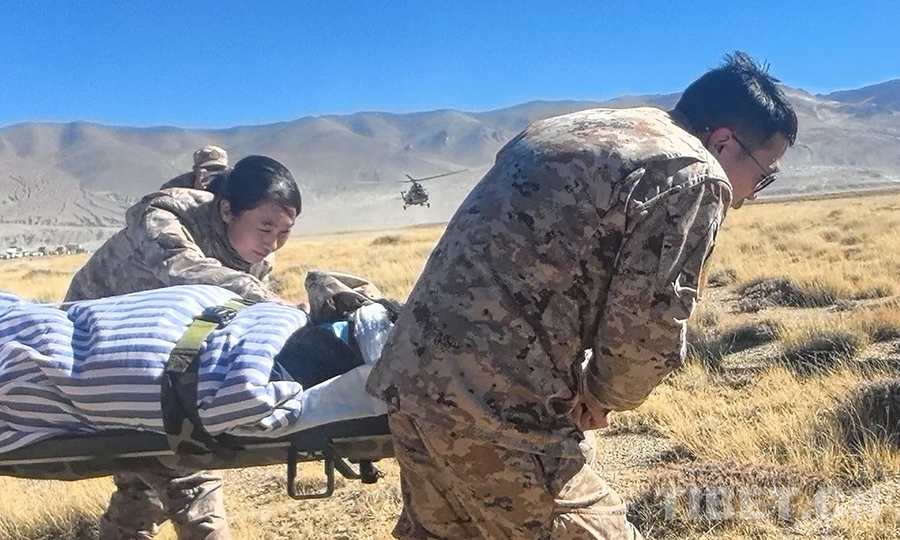 不久后,直升機緩緩降落到長所鄉(xiāng)衛(wèi)生院旁邊的草地上??紤]到現(xiàn)場風沙特別大,軍醫(yī)對傷員的眼睛進行醫(yī)療處理,嚴密包扎。救護車停在比較平坦的位置,醫(yī)療隊員護送傷員小跑著。女軍醫(yī)邊瑞華摘下軍帽給普布格桑的眼睛蓋上,穩(wěn)穩(wěn)護住。一家人沒有去送他,“把丈夫交到解放軍手里,我們一萬個放心。”他的妻子說。