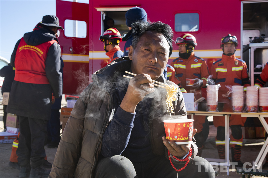 圖為山南市消防救援支隊(duì)消防員在受災(zāi)安置點(diǎn)前發(fā)放熱餐 攝影:趙振宇