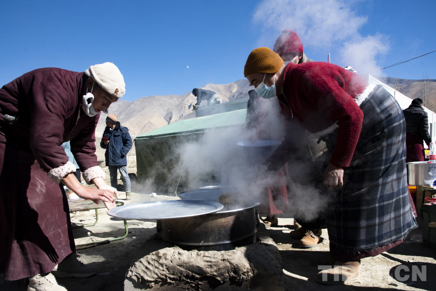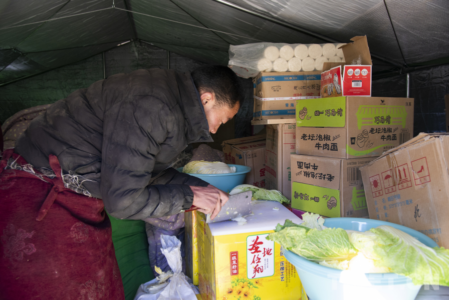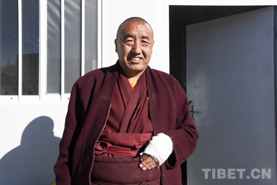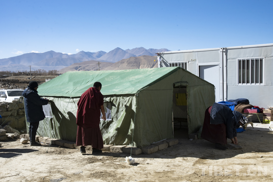 “輕傷的僧尼在我們縣醫(yī)院就診,重傷的僧尼我們第一時間就已轉運至日喀則市人民醫(yī)院,其余的僧尼我們于地震當日就已搭建好帳篷統一在森嘎曲德寺旁的空地進行安置?!痹谑転纳岚仓命c,一間間活動板房整齊排列,僧尼們正在點柴燒水、切大白菜,為今日午餐做準備。