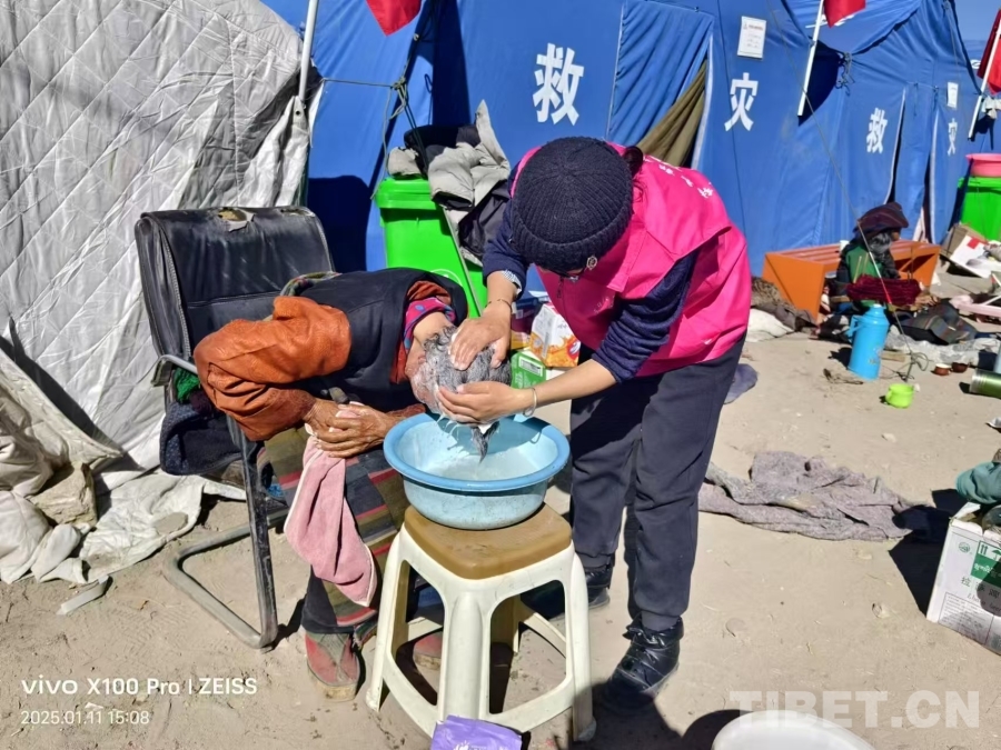 圖為白堆村黨員志愿者為受災(zāi)老人洗頭