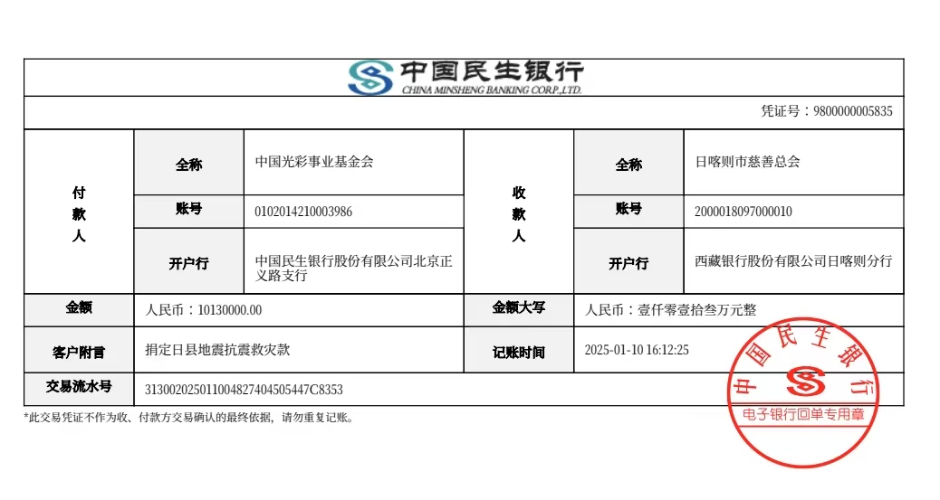 圖為中國光彩事業(yè)基金會捐款回單(其中一筆) 中國光彩事業(yè)基金會供圖