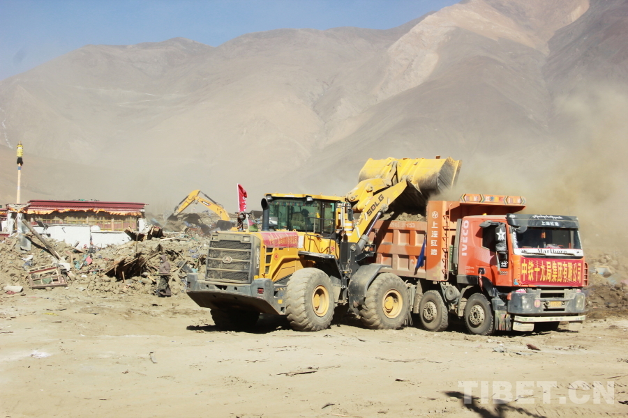 圖為地震重災(zāi)區(qū)西藏自治區(qū)日喀則市定日縣長(zhǎng)所鄉(xiāng)森嘎村危房除險(xiǎn)現(xiàn)場(chǎng),裝載機(jī)正在向渣土車傾倒建筑垃圾 攝影:劉莉
