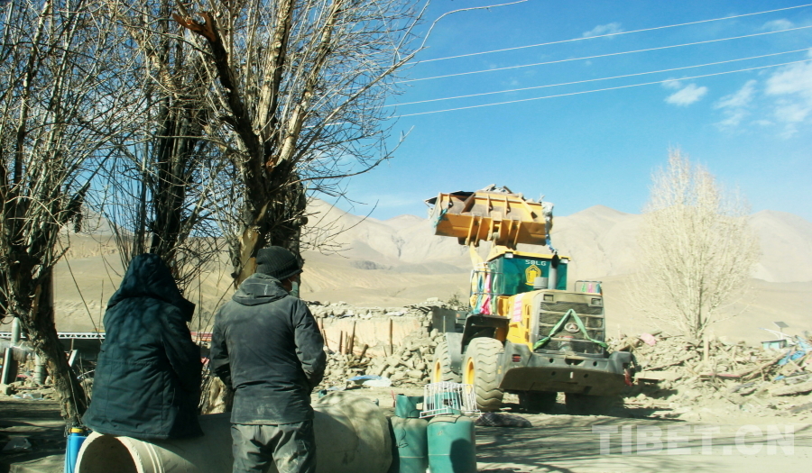 圖為地震重災(zāi)區(qū)西藏自治區(qū)日喀則市定日縣長(zhǎng)所鄉(xiāng)森嘎村除險(xiǎn)現(xiàn)場(chǎng),村民在觀看裝載機(jī)作業(yè) 攝影:劉莉