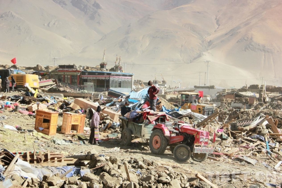 圖為地震重災(zāi)區(qū)西藏自治區(qū)日喀則市定日縣長(zhǎng)所鄉(xiāng)除險(xiǎn)現(xiàn)場(chǎng),村民在已完成除險(xiǎn)的地方搜集尚可再次利用的物資,旁邊未受到嚴(yán)重?fù)p壞的房屋被保留下來(lái) 攝影:劉莉