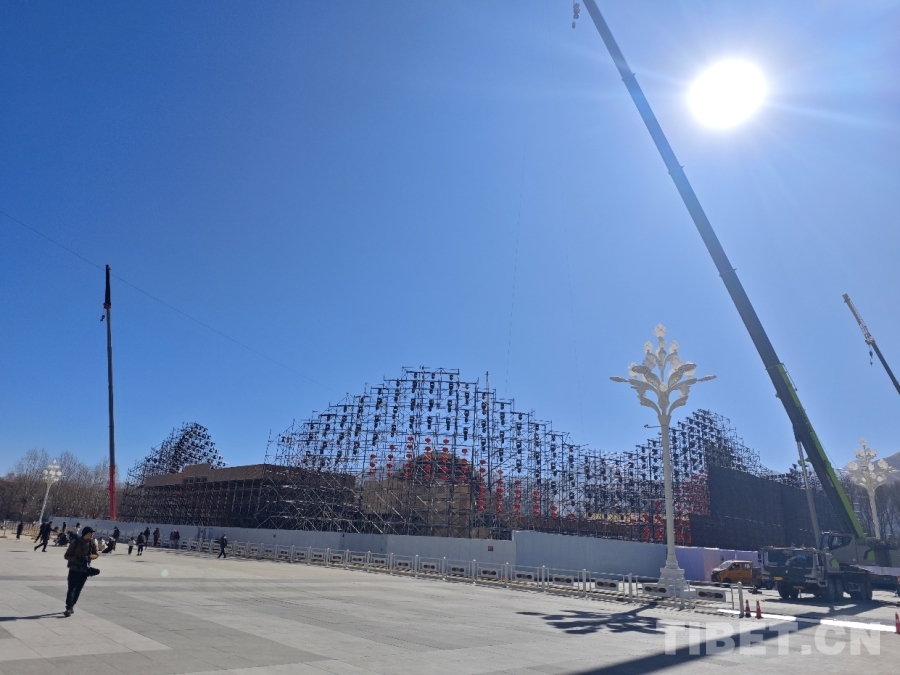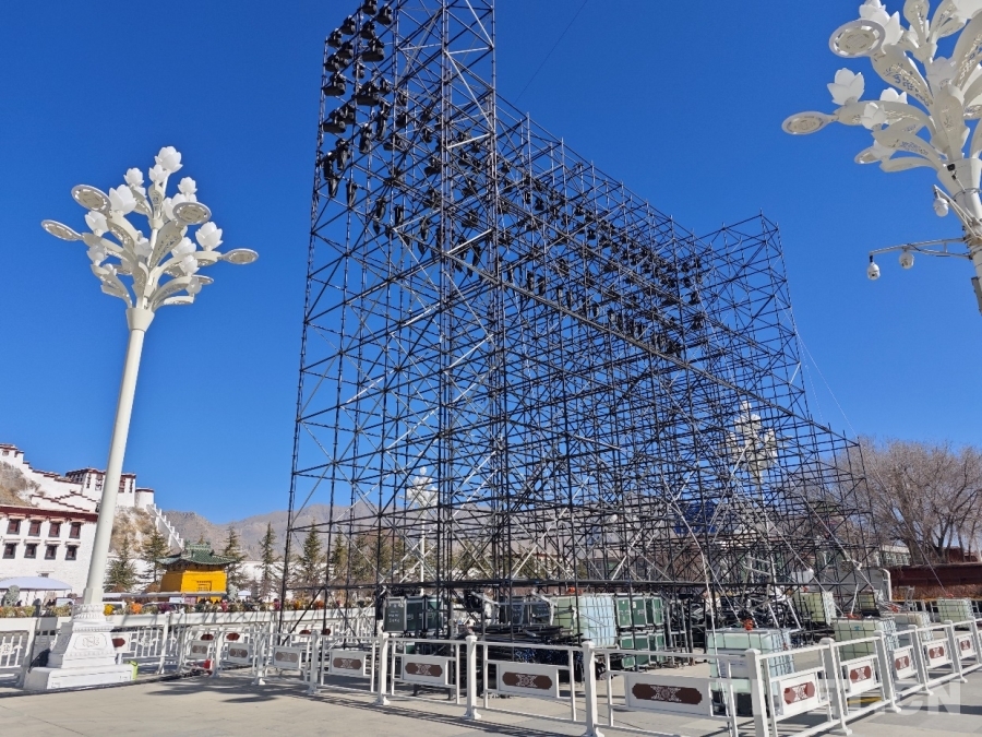 圖為布達(dá)拉宮廣場(chǎng)的春晚分會(huì)場(chǎng)布置現(xiàn)場(chǎng) 攝影:趙婧茹