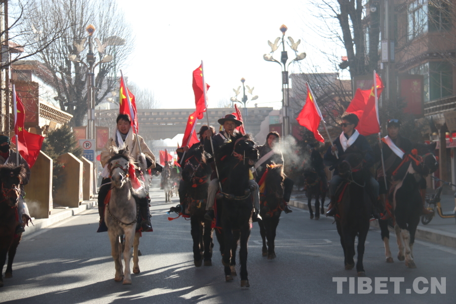 馬術(shù)巡游隊伍來到理塘東山頂上,俯瞰縣城全景,并展開祝福橫幅,用藏漢雙語高聲祝愿全國各族人民新春吉祥。