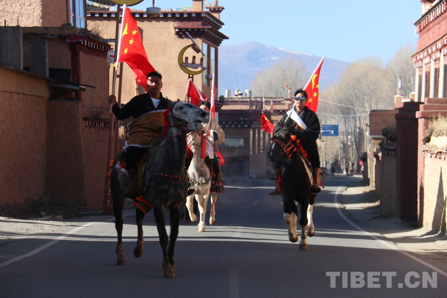 縣城新時代文明實踐廣場上擺放著“中華民族一家親,共度中國吉祥年”的藏式切瑪盒,馬術(shù)巡游隊伍繞行象征幸福安康的切瑪盒,祈愿風(fēng)調(diào)雨順、五谷豐登,祝福祖國繁榮昌盛。