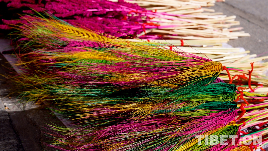 在藏歷新年年貨物品中,提及酥油花就不得不提它的“搭檔”“羅薩梅朵”,正是因為它們的裝點讓藏歷新年中本身就已很精致的“切瑪盒”更加亮眼。“羅薩梅朵”被稱為“冬季里最美麗的花”,是經(jīng)過染色的麥穗和青稞穗制作成的“花卉”。在藏歷新年或節(jié)日之時,人們將其插在盛滿糌粑和青稞的“切瑪盒”上,寓意新的一年美滿、豐收。