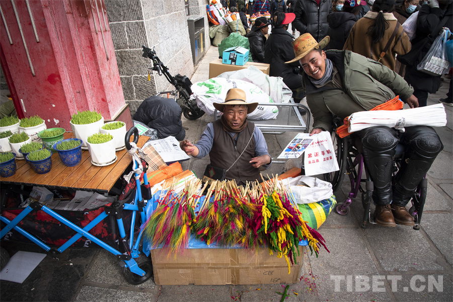 普瓊,來自日喀則市江孜縣,在八廓商城南門前經(jīng)營著自己的“羅薩梅朵”小攤。初見普瓊,我們被他沖著鏡頭的燦爛笑容所吸引。細(xì)細(xì)觀察,普瓊坐在地上的身高卻比別人矮了一大截?!拔覀儚睦_堆龍德慶的批發(fā)市場上買來這批‘羅薩梅朵’在此銷售,就希望能夠在年前的這段時間多賺些小錢補貼家用,所有人都想在新年之時過個充裕的‘好年’,不是嗎?”普瓊因一次意外高位截癱,失去雙腿的他并沒有消沉。他選擇積極面對生活,用自己的雙手和命運抗?fàn)?,用堅強和勤勞讓自己和全家過上更好的生活。與普瓊不幸的經(jīng)歷相比,我們每個人過的每個年何嘗不都是一個個“好年”呢?普瓊對生活的那種熱愛,對明天會更好的堅定,何嘗不是我們對每一個“好年”所孜孜追求的呢?