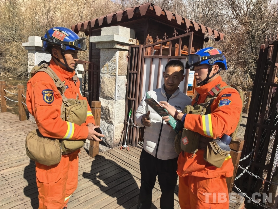 圖為西藏森林消防總隊特勤大隊指戰(zhàn)員在拉魯濕地向來往市民游客普及防火知識