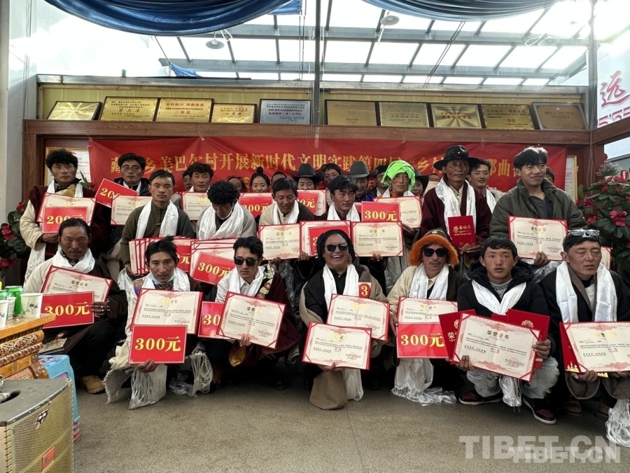 圖為藏比鄉(xiāng)美巴爾村比賽結(jié)束后,獲獎?wù)吆嫌傲裟?nbsp;