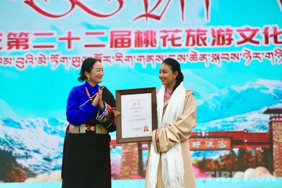 圖為網(wǎng)絡(luò)達(dá)人德吉卓瑪被授予波密縣旅游形象大使證書