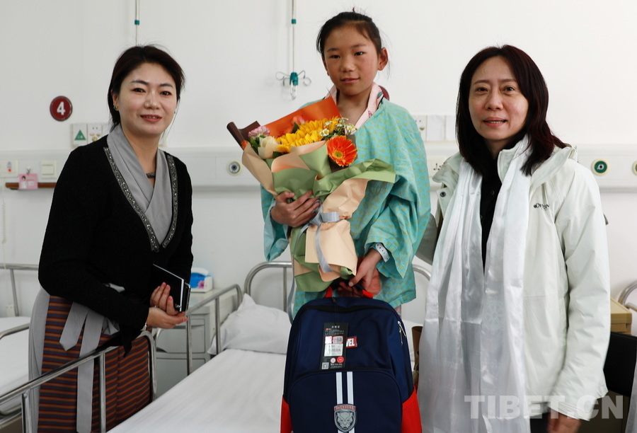 圖為北京啟明星辰慈善公益基金會理事長王?,摚ㄓ乙唬┡c四川省甘孜州石渠縣衛(wèi)健局副局長向巴啟西(左一)向在北京朝陽醫(yī)院接受救治的四川省甘孜州石渠縣脊柱側(cè)彎患兒贈送鮮花與學(xué)習(xí)用品 攝影:劉莉