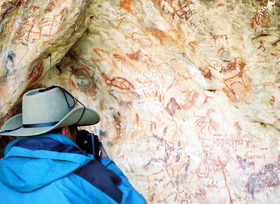 圖為科考人員在對(duì)納木錯(cuò)扎西半島洞穴巖畫(huà)進(jìn)行考察拍照(唐召明2001年攝)