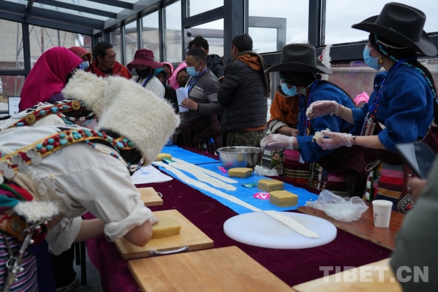 圖為“拉拉”和“推”制作現(xiàn)場(chǎng)?!袄焙汀巴啤笔遣乇豹?dú)具特色的一種高品質(zhì)乳制品,它可以給牧民提供極高的營(yíng)養(yǎng),是招待客人和饋贈(zèng)親朋好友的食物之一。