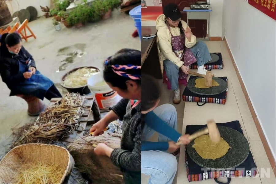 關(guān)于藏紙的起源,學(xué)術(shù)界更偏向《舊唐書·吐蕃》中的記載:唐高宗時(shí)期,吐蕃贊普葉宗弄贊(注:松贊干布)“因請(qǐng)蠶種及造酒、碾、磑、紙、墨之匠”,隨文成公主入藏。自此,西藏關(guān)于紙的技藝因地而成,代代相傳。1300多年后的一個(gè)清晨,在金東鄉(xiāng)的工坊內(nèi),記者見到了金東藏紙制造技藝非遺傳承人加里,也看到了藏紙一大分支——金東藏紙中的古法脈搏。