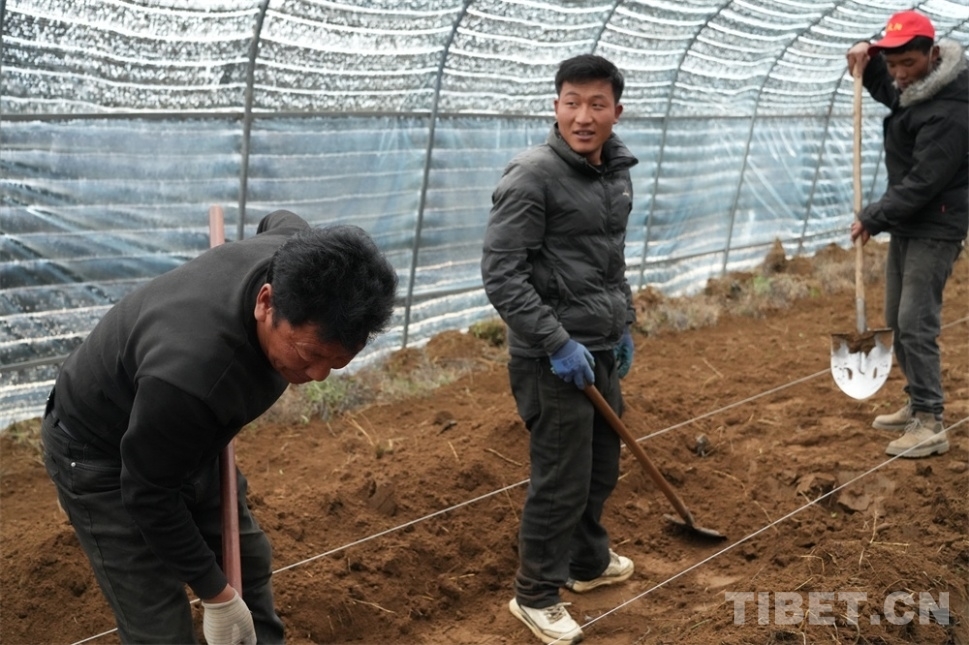圖為紅太陽(yáng)家庭農(nóng)場(chǎng)員工普布扎西(中)和同事們?cè)诖笈锢锲秸寥馈z影:王茜