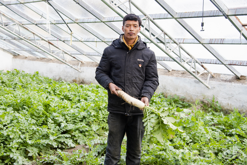 圖為定日縣長所鄉(xiāng)嘎旦村村委會(huì)主任頓珠在震后修繕的蔬菜溫室大棚內(nèi)為記者展示棚內(nèi)種植出的白蘿卜 攝影:趙振宇