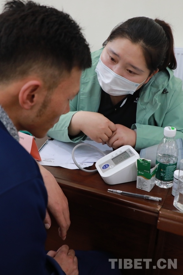 圖為義診現(xiàn)場,清華大學(xué)玉泉醫(yī)院神經(jīng)內(nèi)科主治醫(yī)師王靜為指戰(zhàn)員測量血壓后,對其進(jìn)行血壓相關(guān)疾病科普,并根據(jù)具體情況建議其調(diào)整飲食結(jié)構(gòu) 攝影:楊月云