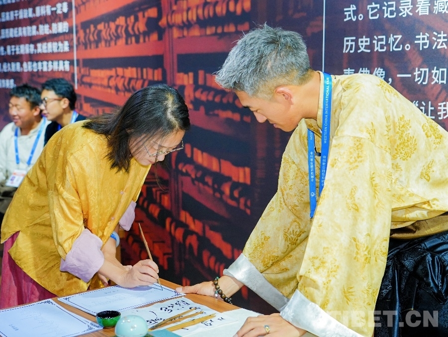 圖為參觀者正在現(xiàn)場(chǎng)體驗(yàn)藏文書法