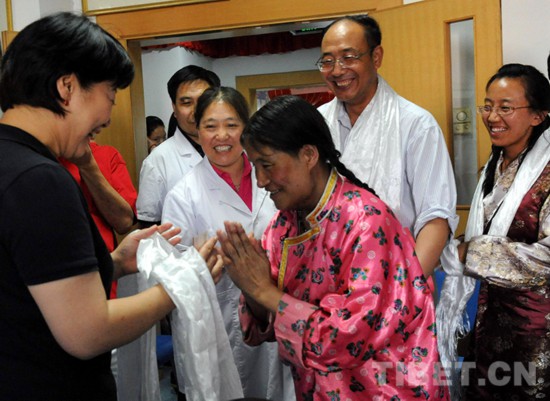 圖為術(shù)后的斯求卓瑪在北京藏醫(yī)院向幫助她治病的北京安貞醫(yī)院醫(yī)生顧虹(左一)和時任新華社記者唐召明(右二)等人敬獻(xiàn)哈達(dá)(王普2010年5月20日攝)