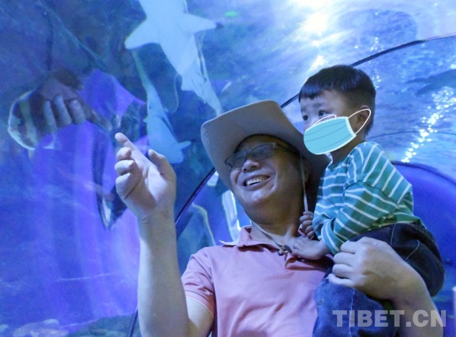 圖為唐召明抱著小卓瑪在太平洋海底世界 攝影:吉色