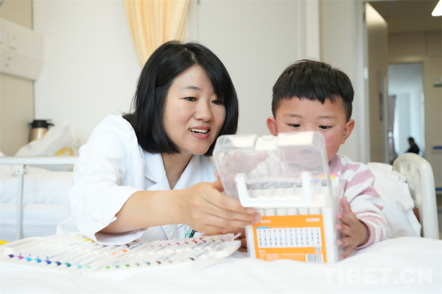 6月10日,小卓瑪在北京的治療告一段落,可以出院了。協(xié)會會長金書波等相關(guān)負(fù)責(zé)人和醫(yī)院的陳偉、韓正學(xué)等前來看望小卓瑪。此時的她已經(jīng)沒有了初來醫(yī)院的緊張和羞澀,她覺得協(xié)會的爺爺奶奶、醫(yī)院的叔叔阿姨,都是她的親人和朋友。她舍不得摘下協(xié)會爺爺帶上的哈達(dá),拿著醫(yī)生阿姨送的畫筆寫寫畫畫,用還生澀的普通話跟醫(yī)生護(hù)士一個一個打招呼、擊掌,說“你好”“謝謝”……小小的身影在明亮舒適的病房里跑來跑去,笑聲清脆,充滿了活力。
