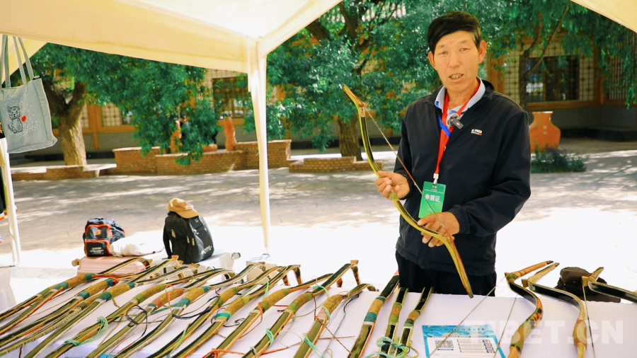 馬國財是一位來自青海省海東市樂都區(qū)的南山傳統(tǒng)牛角弓非遺傳承人,自曾祖父起他家在制作牛角弓方面的技藝是家喻戶曉的。他深受父輩的影響,做弓技藝更是嫻熟。此次活動,他帶來了自己的幾十張得意之作“南山傳統(tǒng)牛角弓”,在現場向對牛角弓感興趣的游客耐心地講解選材、打磨、粘合、鋪筋、扎把、陰干、調試、加牛角、打磨、貼樺皮、上色等弓箭的制作過程,以及在生活當中的實際應用,讓更多的人了解到它不僅僅是一張普通的弓,更是祖祖輩輩的智慧結晶和珍貴非遺。