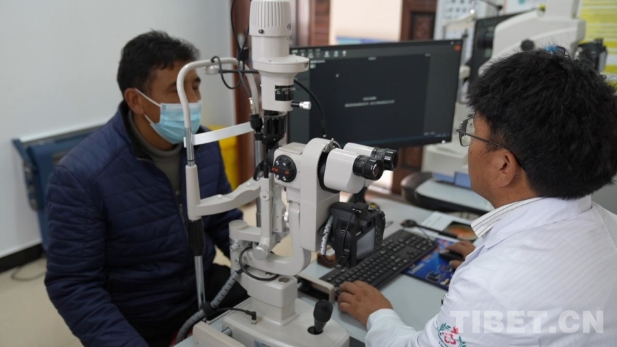 圖為崗巴縣中心醫(yī)院眼科醫(yī)生正為患者做檢查