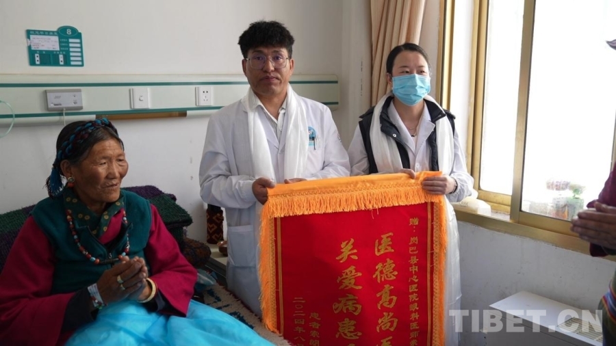 圖為患者央珍(左一)向崗巴縣中心醫(yī)院眼科醫(yī)生贈送錦旗