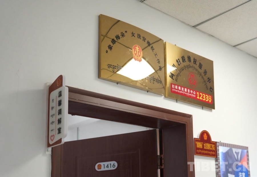 圖為阿里地區(qū)中級人民法院的溫馨調解室及“象雄梅朵”女法官維權工作站牌匾 攝影:邊子捷