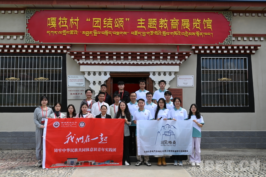 圖為西藏民族大學實踐團在嘎拉村“團結(jié)頌”主題教育展覽館前的合影